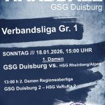 Posted on 19. Januar 2026GSG Duisburg – HSG Alpen/Rheinberg 24:15 (7:9) Sage und schreibe 10 Minuten dauerte es bis die ersten beiden Tore fielen. Die erste Spielhälfte war geprägt von technischen Fehlern und Fehlwürfen beider Teams. Der Tabellenführer aus Rheinberg hatte zur Halbzeit mit 7:9 leicht die Nase vorn. In der Halbzeitpause müssen wohl die richtigen Worte gefunden worden